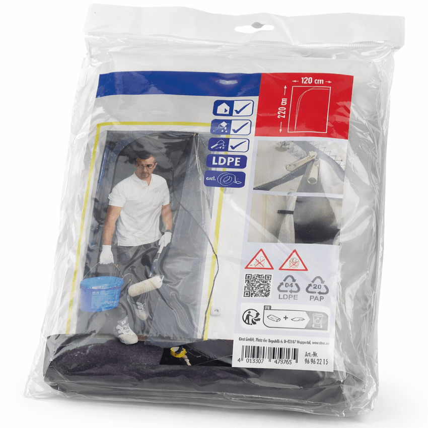 Pölynsuojaovi L-malli 120 × 220 cm on käytännöllinen tilanjakaja, joka rajoittaa tehokkaasti pölyn ja lian leviämistä remontti- ja rakennustöiden aikana. Muoviovi teipataan helposti oviaukkoon ja muodostaa selkeän suojan työskentelyalueelle.